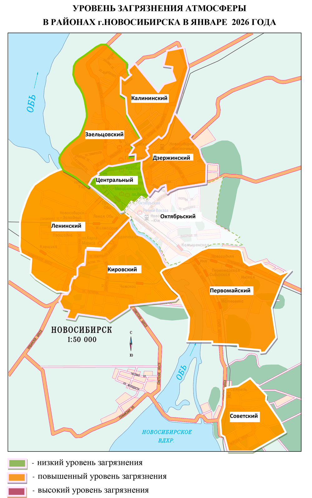 г. НОВОСИБИРСК.- В январе 2026г. уровень загрязнения атмосферы города оценен как повышенный (взвешенные вещества СИ=1,9 НП=7,4%, фенол СИ=1,7 НП=1,3%).
